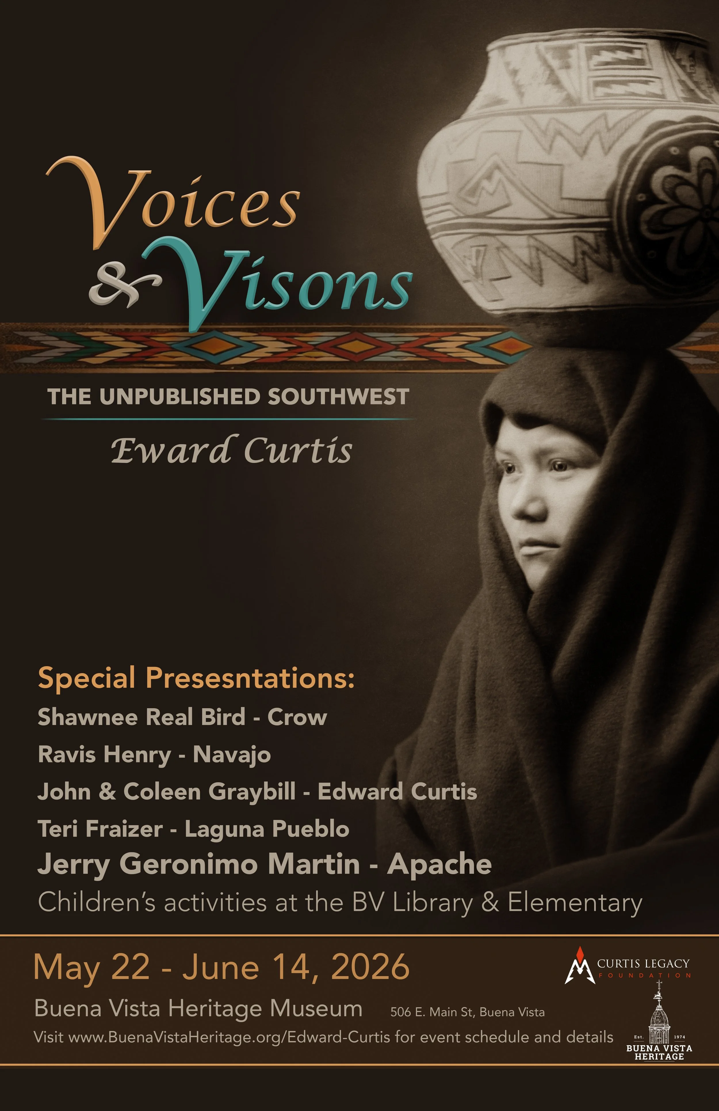 The Curtis Legacy Foundation and Buena Vista Heritage are proud to present their third collaborative exhibition, featuring Edward S. Curtis’ previously unpublished photographs of the Southwest from the early 1900s. Blending artistic beauty with meaningful education, this exhibition invites visitors into a deeper understanding of Native history and culture. Join the dialogue as Native American speakers share the stories, traditions, and perspectives of their communities.